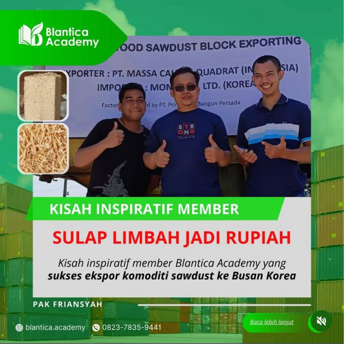 Friansyah, seorang pemuda asal Tangerang, adalah contoh inspiratif bagaimana kreativitas dan wawasan ekspor bisa mengubah limbah menjadi peluang besar. Setelah mengikuti pelatihan di Blantica Academy, ia mulai mencari potensi produk unik di sekitarnya dan menemukan wood pellet serta serbuk kayu (sawdust) sebagai komoditas yang jarang dilirik. Dengan ketekunan dan pengetahuan yang didapat, Friansyah berhasil mengekspor sawdust ke Korea, membuka peluang baru di pasar internasional. Kisahnya membuktikan bahwa dengan inovasi dan bimbingan yang tepat, limbah sekalipun bisa menjadi sumber penghasilan yang menginspirasi banyak orang.