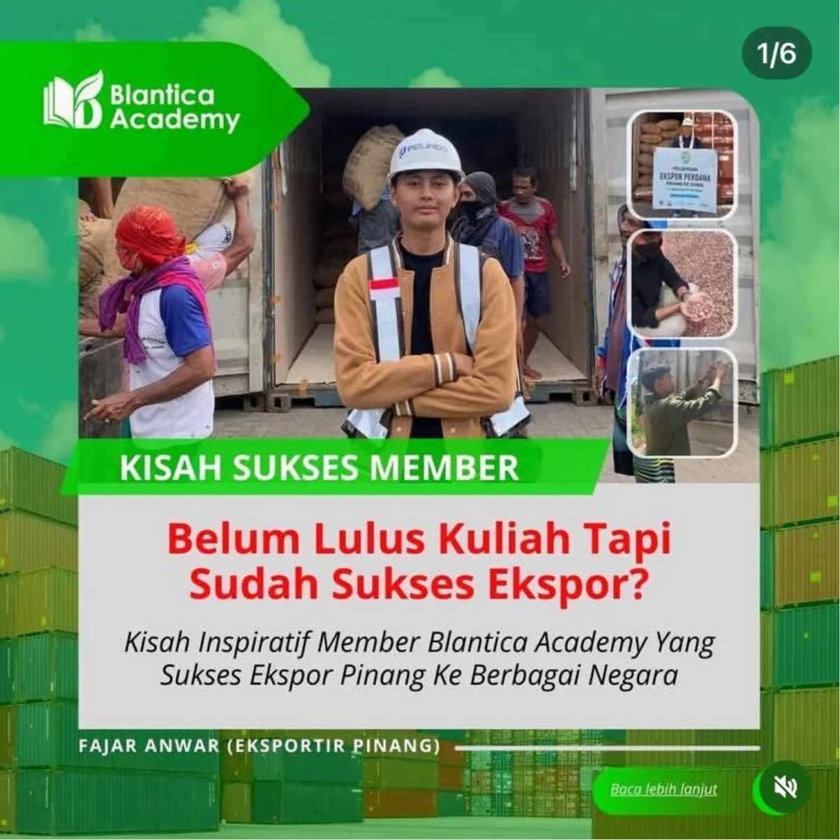 Fajar Anwar, seorang pemuda asal Jambi, adalah salah satu bukti nyata bagaimana Blantica Academy mendukung generasi muda dalam mengembangkan potensi mereka di dunia ekspor. Bergabung di usia 18 tahun saat masih berkuliah, Fajar belajar untuk mandiri dan mulai merintis bisnis ekspor pinang, komoditas unggulan daerahnya. Dalam waktu dua tahun, berkat bimbingan Blantica Academy, ia berhasil mengembangkan bisnis yang kini rutin mengirimkan pinang ke berbagai negara dengan valuasi mencapai Rp20 miliar. Dedikasinya tidak hanya membawa keberhasilan pribadi tetapi juga menginspirasi banyak pemuda lain di daerahnya untuk mengikuti jejaknya.