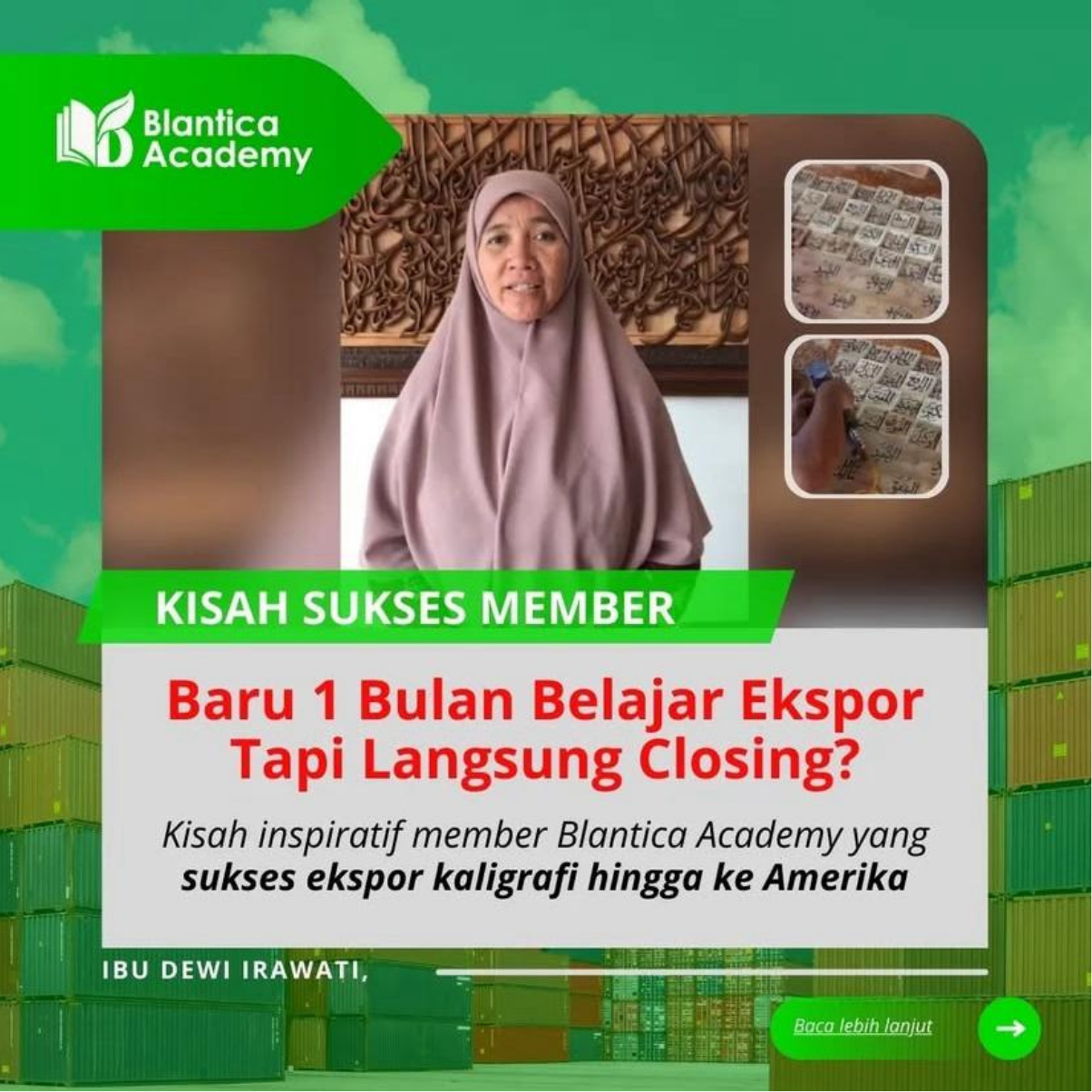 Ibu Dewi, seorang pengrajin kaligrafi asal Jepara, adalah salah satu member Blantica Academy yang berhasil membawa produknya ke panggung internasional. Dengan keinginan untuk melanjutkan usaha suaminya dan memperluas pasar hingga ke luar negeri, Ibu Dewi memanfaatkan bimbingan kami untuk memasarkan produknya melalui platform ETSY. Hasilnya luar biasa—dalam waktu satu bulan, ia berhasil mengirimkan kaligrafinya ke Amerika Serikat. Hingga kini, produk kaligrafi Ibu Dewi telah mencapai empat negara berbeda dengan nilai jual yang meningkat hingga dua kali lipat dari harga lokal.